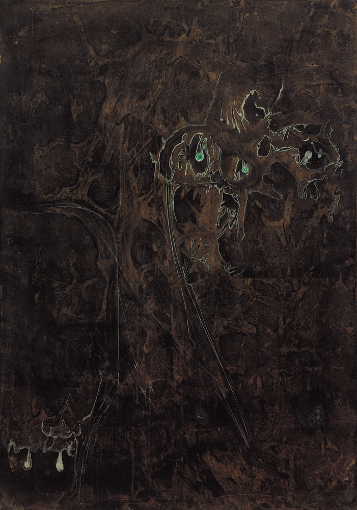 GIANNI DOVA Roma 08/01/1925 - Pisa 1991  Foresta, (1952) tecnica mista su carta applicata su masonite cm. 99,5x69, firma, etichetta della Galleria d'Arte Borgogna (MI) e timbri con archivio A/3779 a cura del Salone Annunciata (MI) al retro.
