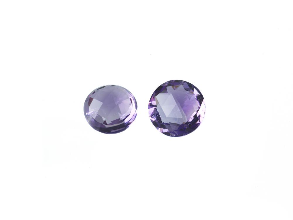 COPPIA DI AMETISTE PER CT 26.53 di forma rotonda, taglio composito, 15,07x8,56; 16,03x10,19 AMETHYSTE