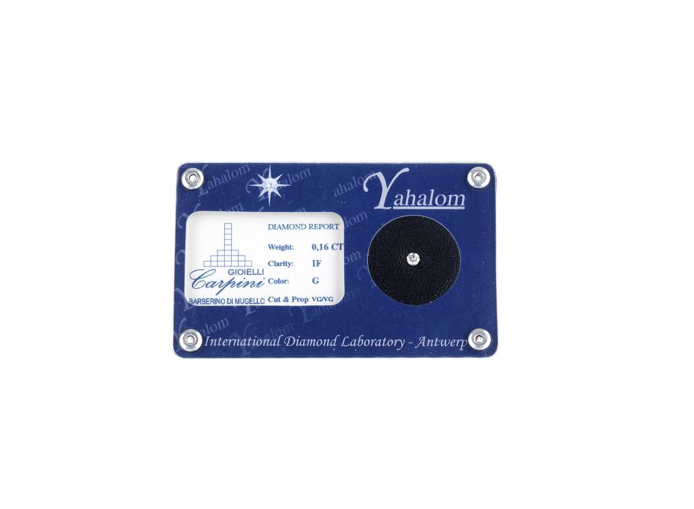 entro contenitore sigillato riportante diciture di analisi gemmologica effettuata da International Diamond Laboratory Yahalom, Antwerp per Gioielleria Carpini che indicano colore G, purezza IF