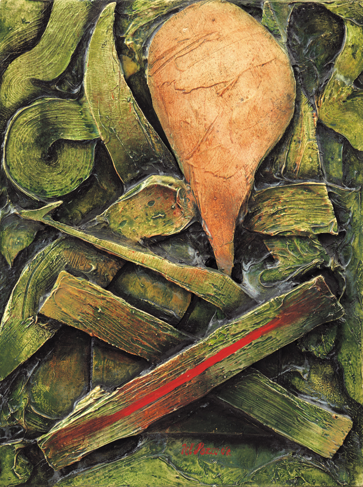 LUCIO DEL PEZZO Napoli 1933  Pittura (piccolo Achab), 1962 tecnica mista e assemblaggio su tela cm. 40x30, firma in basso al centro, titolo, firma, anno ed etichetta della Galleria Schwarz (MI) al retro.