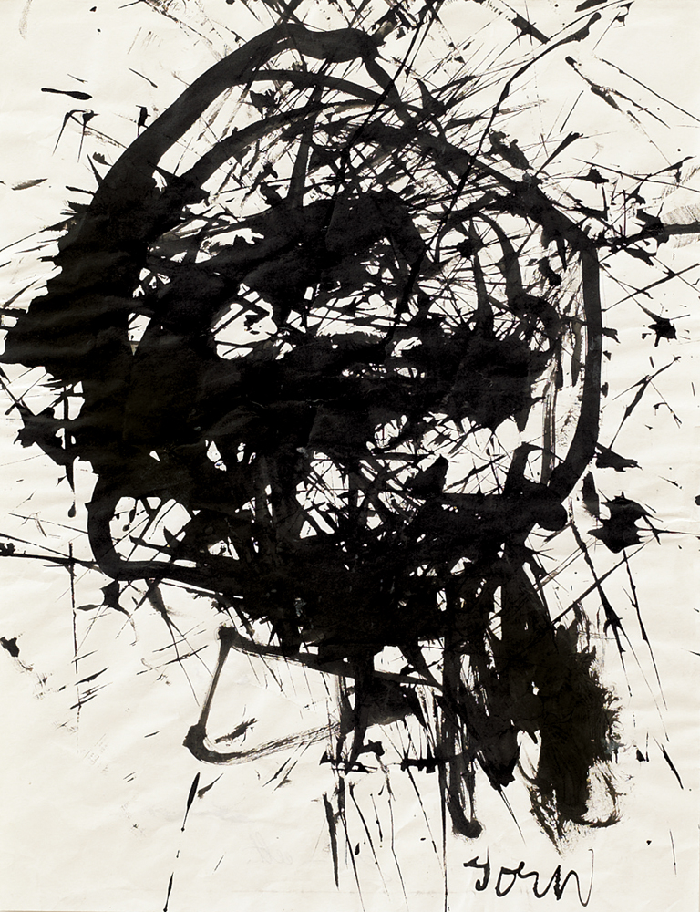 ASGER JORN Vejrun 03/04/1914 - Aarhus 1973  Senza titolo, 1961-62 china su carta cm. 28x21,5; firma in basso a destra, dichiarazione d'autenticità dell'artista datata 25/06/1962 su foto, timbro e firma per autentica di Christian Stein (MI) su foto.
