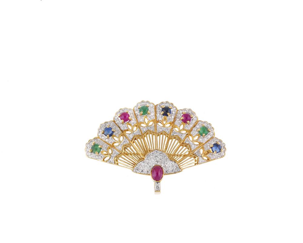 SPILLA IN ORO GIALLO, ORO BIANCO, DIAMANTI, RUBINI, ZAFFIRI E SMERALDI realisticamente modellata come un ventaglio, diamanti per ct 0.50 circa, punzone 18 kt, dimensioni cm 3,2x4,6, g 11 circa DIAMOND, RUBY, EMERALD, SAPPHIRE AND YELLOW GOLD BROOCH