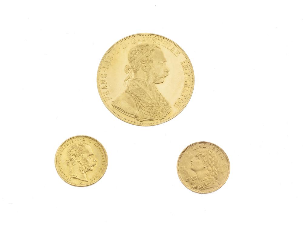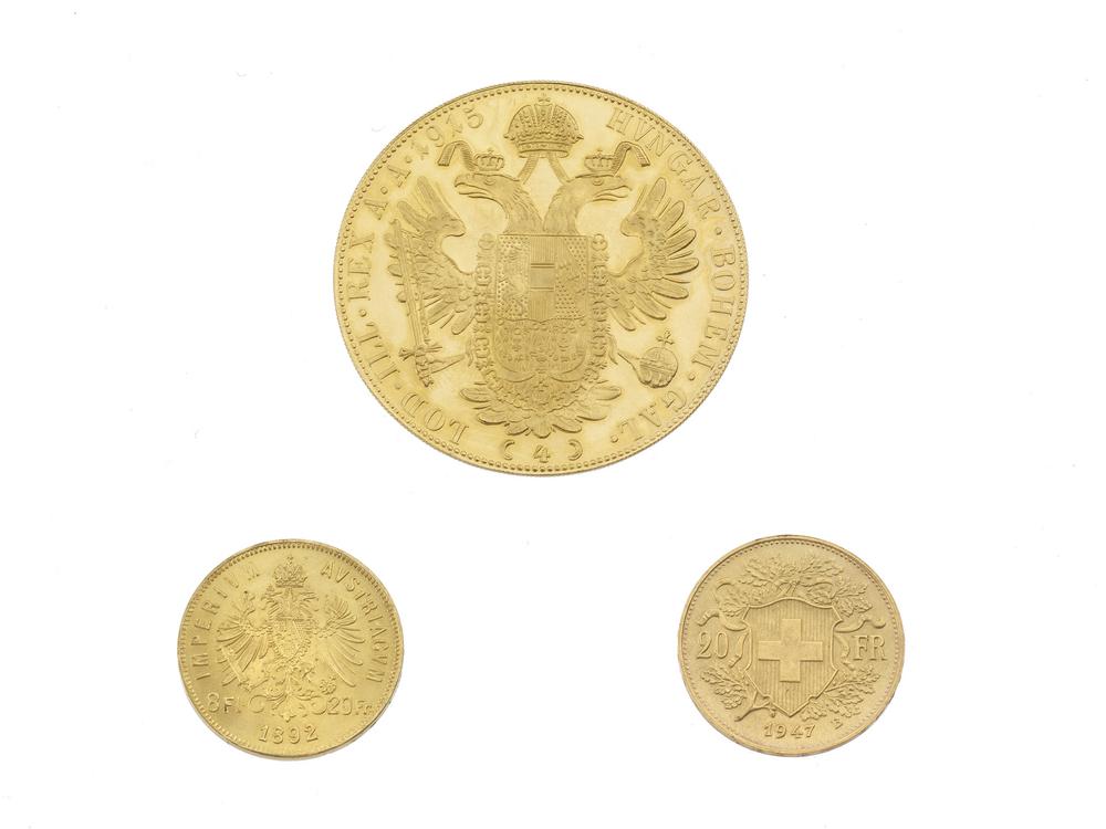 LOTTO DI TRE MONETE IN ORO: - 4 ducati Austria Francesco Giuseppe, g 13,96, titolo 986/1000, diametro mm 39,5 - 1 marengo Austria Francesco Giuseppe, g 6,45, titolo 900/1000, diametro mm 21 - 20 franchi (marengo) Svizzera 1947, g 6,45, titolo 900/1000, diametro mm 21 THREE GOLD COINS