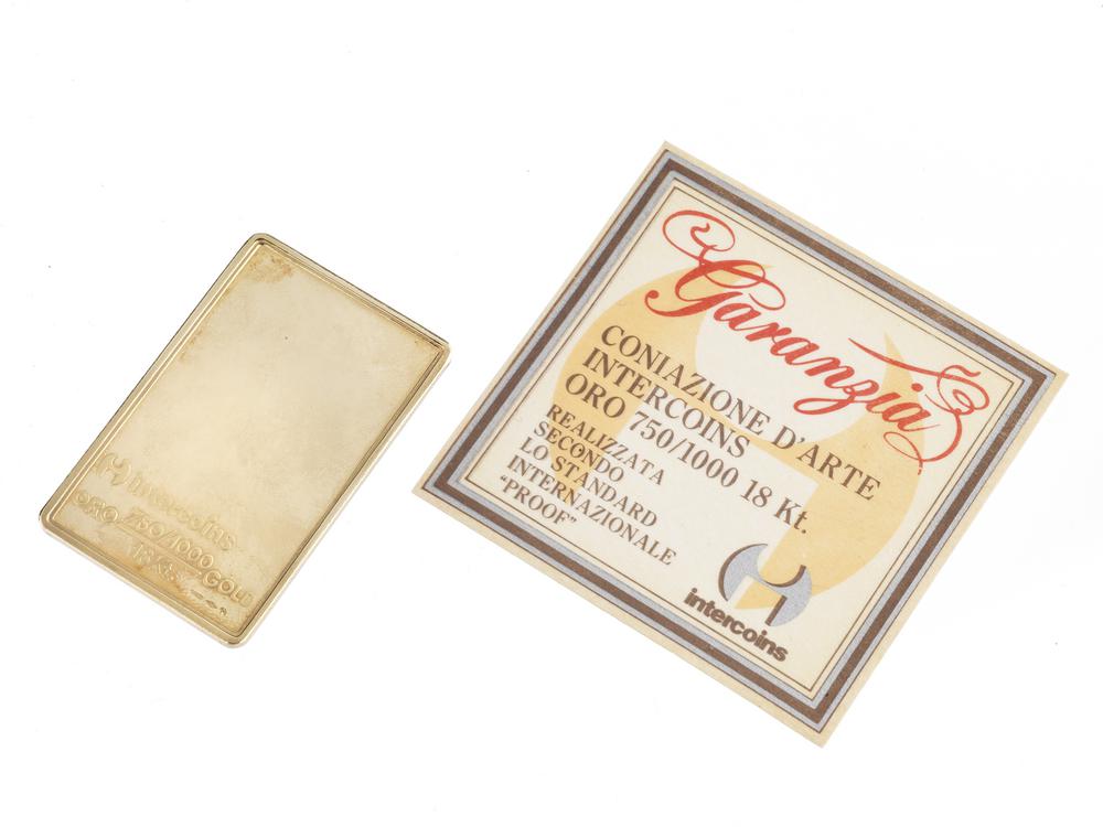 PLACCHETTA IN ORO GIALLO 18 K di forma rettangolare, recto raffigurante nudo femminile su cornucopia con titolo ‘La prosperità’, firmata B. Galoppi, sul verso punzoni Intercoins, 18 kt e 750/1000, dimensioni cm 5x3,2, g 25, corredata di astuccio originale e garanzia 18 K YELLOW GOLD PLAQUE