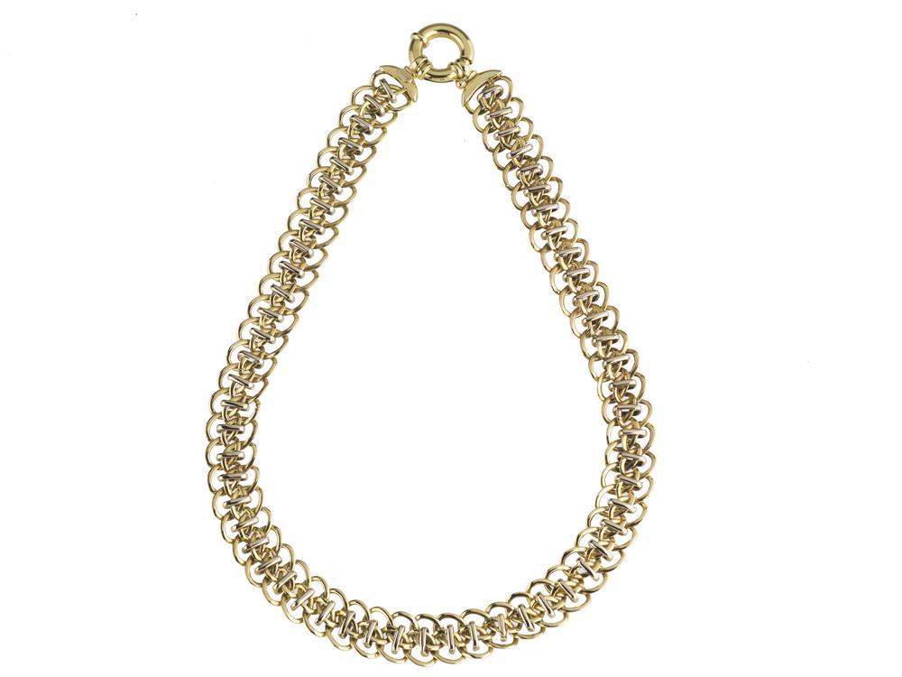 COLLANA IN ORO GIALLO disegnata come un nastro traforato realizzato a maglie fantasia, punzone 750, g 35 YELLOW GOLD NECKLACE