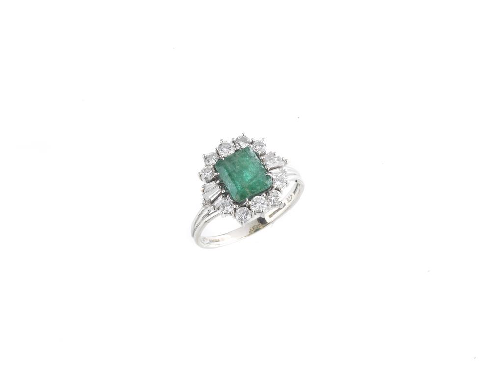 ANELLO IN ORO BIANCO, SMERALDO E DIAMANTI montatura a ‘margherita con smeraldo ottagonale montato a griffes entro cornice in diamanti taglio brillante rotondo e baguette per ct 1 circa, punzone 750, misura 20, g 8 EMERALD, DIAMOND AND WHITE GOLD RING