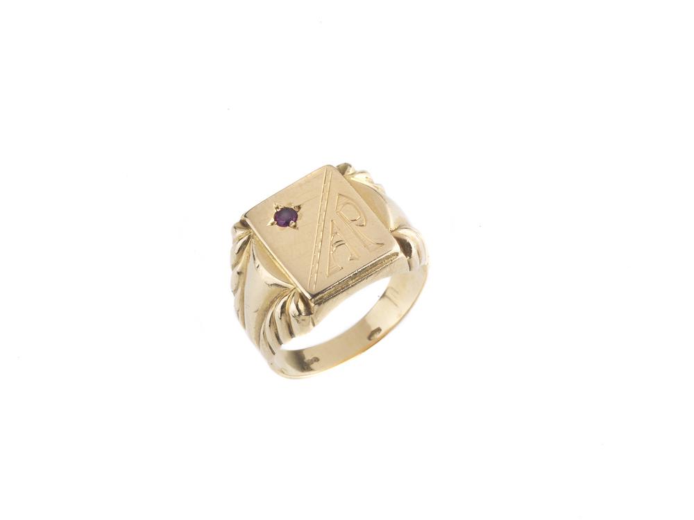 ANELLO IN ORO GIALLO fascia bombata e scanalata centrata da scudo rettangolare con iniziali AP incise e piccolo rubino entro castone stellato, punzone 750, misura 23, g 9 YELLOW GOLD RING