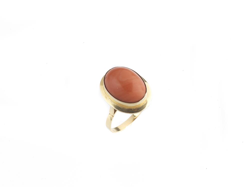 ANELLO IN ORO GIALLO E CORALLO al centro un corallo ovale cabochon di mm 16x12, punzone 750, misura 15,5, g 5 CORAL AND YELLOW GOLD RING