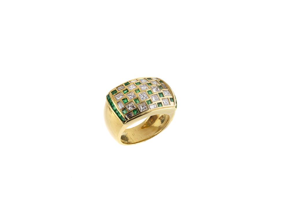 ANELLO IN ORO GIALLO, SMERALDI E DIAMANTI montatura a fascia bombata centrata da uno scudo rettangolare decorato da un motivo a scacchiera in diamanti e smeraldi per ct 2,15 circa, punzone 750, misura 14, g 13 EMERALD, DIAMOND AND YELLOW GOLD RING