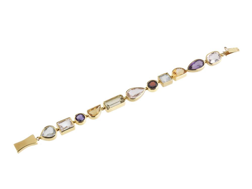 BRACCIALE IN ORO GIALLO E PIETRE SEMI-PREZIOSE realizzata ad una fila di acquemarine, ametiste, citrini e altre pietre semi-preziose di forme e colori diversi montate entro castoni in oro giallo, fermatura sagomata in oro giallo, punzone 750, lunghezza cm 18,5, g 32 SEMI-PRECIOUS STONES AND YELLOW GOLD BRACELET