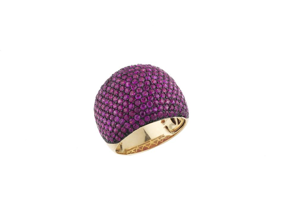 ANELLO IN ORO ROSA, ORO BRUNITO E RUBINI a fascia bombata impreziosita da un pavé di rubini per ct 4.7 circa montati entro castoni a griffes in oro brunito, misura 17, punzone 750, g 10 circa RUBY, BURNISHED AND PINK GOLD RING