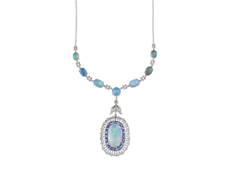 Lotto 354 | COLLANA IN ORO BIANCO, OPALI, ZAFFIRI E DIAMANTI la parte anteriore...