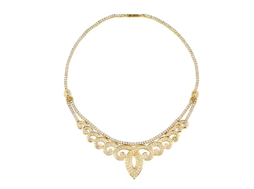 COLLANA IN ORO GIALLO E DIAMANTI la parte centrale decorata da un motivo a volute in pavé di diamanti profilato da una linea di diamanti montati a griffes, la parte posteriore realizzata ad una fila di diamanti analogamente montati per complessivi ct 11,50 circa, punzone 750, g 67 circa DIAMOND AND YELLOW GOLD NECKLACE