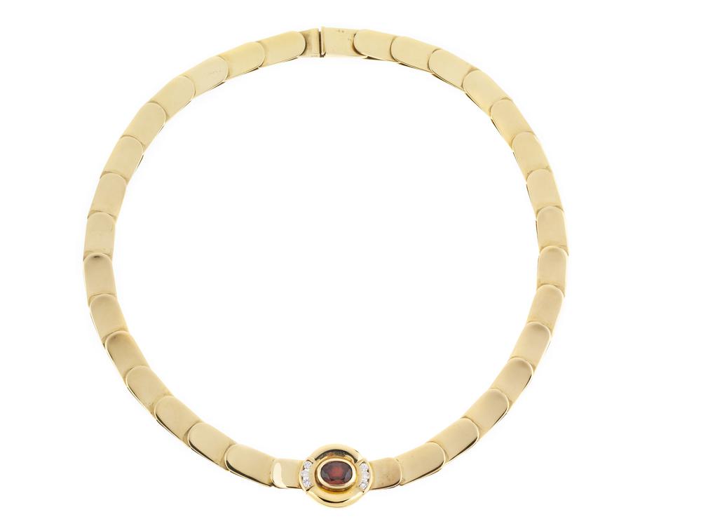 COLLANA IN ORO GIALLO, DIAMANTI E GRANATO realizzata ad una fila di maglie ovali intersecate l’una all’altra ad effetto squama, al centro un elemento ovale decorato da diamanti per ct 0.35 circa e da un granato, punzone 750, lunghezza cm 42,5, peso g 78,5 DIAMOND AND YELLOW GOLD NECKLACE