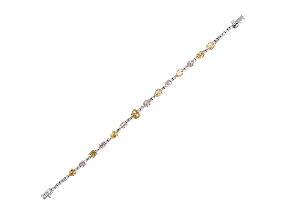BRACCIALE IN ORO BIANCO, DIAMANTI FANCY E DIAMANTI INCOLORI formato da quattordici diamanti di taglio a goccia e ovali, colori fancy yellow e pink in diverse gradazioni cromatiche per complessivi ct 6 circa, posti in linea ed intercalati da diamanti incolori taglio brillante rotondo per ct 1.10 circa, punzone 750, lunghezza cm 18,5, g 12 circa Corredato di tre report nn. 201631507- 201631506 - 201631501e dieci short report IGI datati febbraio 2016 FANCY YELLOW AND PINK DIAMOND BRACELET