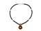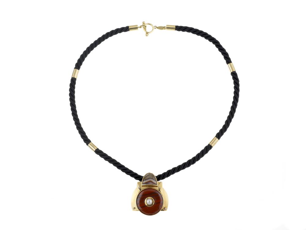 COLLANA CON PENDENTE IN ORO GIALLO, AGATA E PERLA, RITA GALLÉ, 1980 CIRCA il pendente di forma sagomata decorato da inserti geometrici in agata striata e da una perla coltivata è sospeso ad una collana realizzata in cordonetto torchon di seta nera su cui sono montati elementi cilindrici in oro, fermatura in oro giallo firmata Rita Gallè, lunghezza collana cm 50, dimensioni pendente cm 4x3,5, peso complessivo g 34 AGATE, PEARL AND YELLOW GOLD PENDANT WITH A SILK CORD AND YELLOW GOLD NECKLACE, RITA GALLÉ, CIRCA 1990