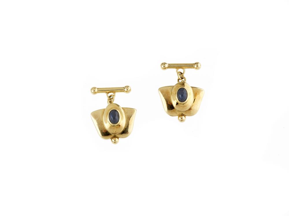 PAIO DI GEMELLI IN ORO GIALLO E ZAFFIRI, RITA GALLÉ, 1990 CIRCA di forma bombata e sagomata, ciascuno impreziosito da uno zaffiro ovale cabochon, punzoni 750 e Rita Gallé, dimensioni bottone cm 2x1,5, g 14 circa SAPPHIRE AND YELLOW GOLD CUFFLINKS, RITA GALLÉ, CIRCA 1990