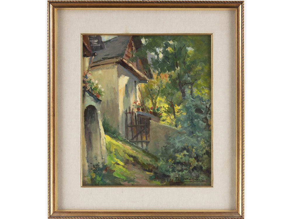 Tullio Giovenzani (1907-1975) Scorcio di paese montano con fiori 33,5x28,5 cm Olio su compensato