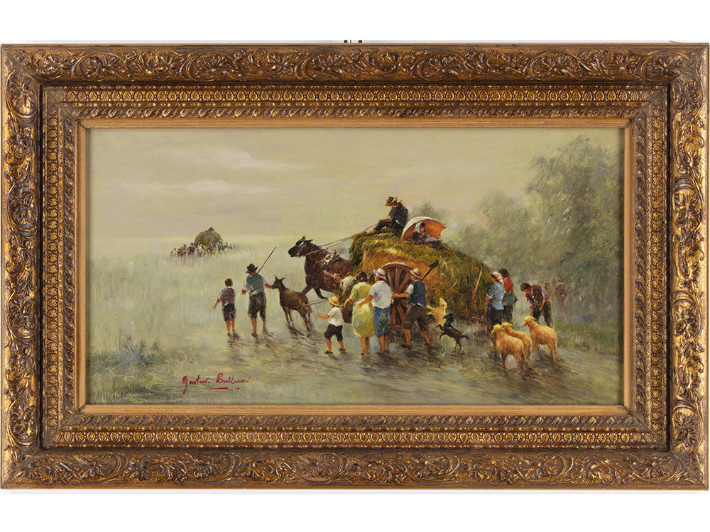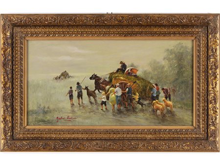 Gustavo Bellusci (1945) Paesaggio di campagna con figure 31x80 cm Olio su...