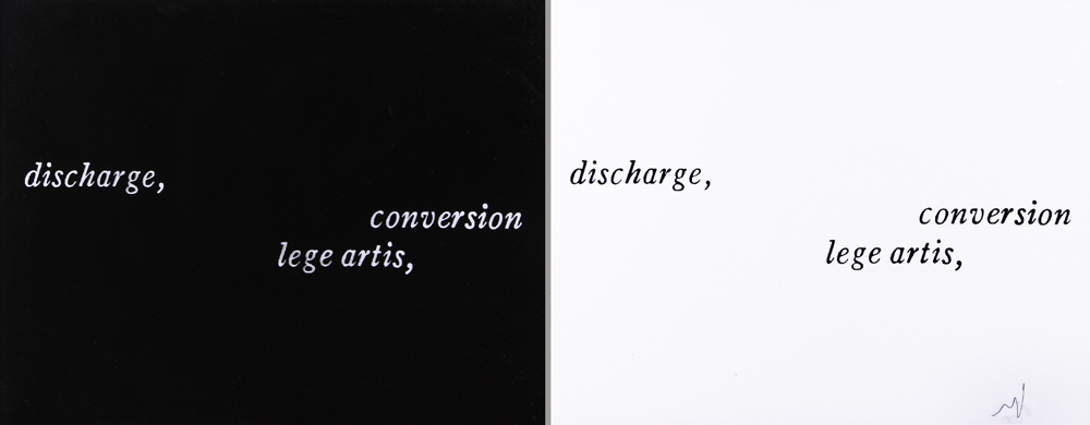 JOSEPH KOSUTH Toledo 1945 Discharge, conversion lege artis tecnica mista e plastiche (dittico seriale) cm. 39x49 cadauno (totale cm. 39x98), firma e timbro a secco dello Studio Joseph Kosuth 1989 in basso a destra dell'opera bianca.
