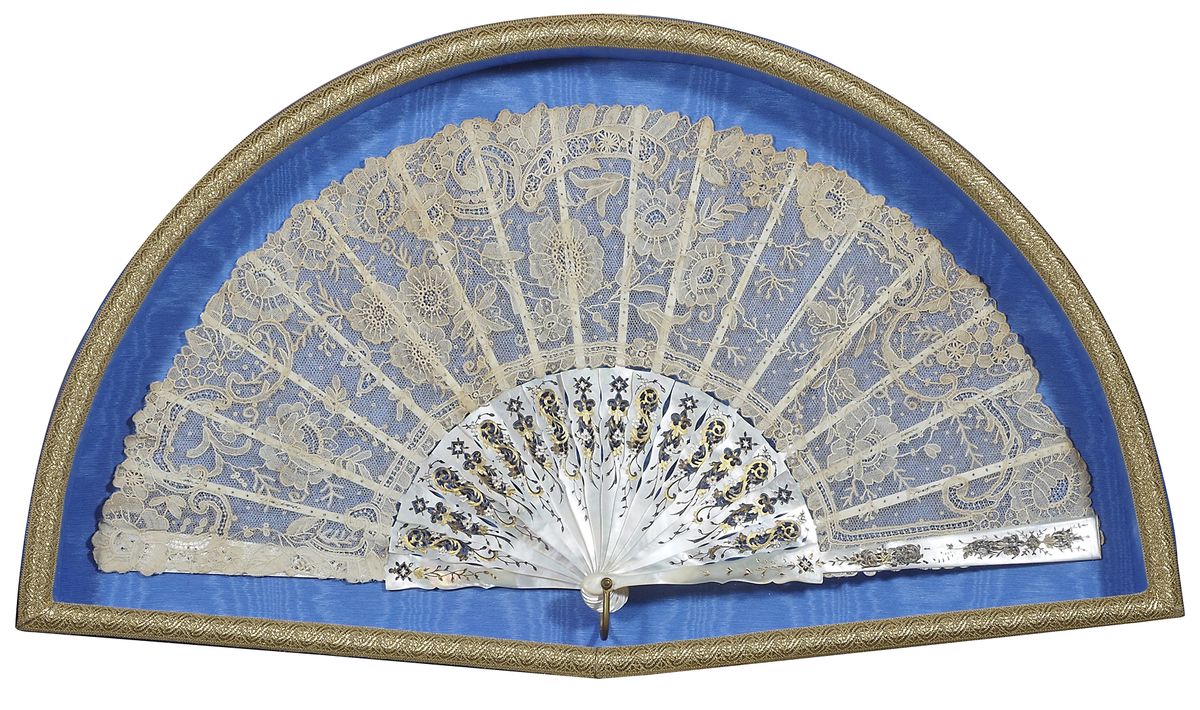 Ventaglio da matrimonio con lavorazione a pizzo ad ago di Bruxelles, stecche in madreperla traforate e incise. Entro teca. Inizio XX secolo. cm. tot 32x57.