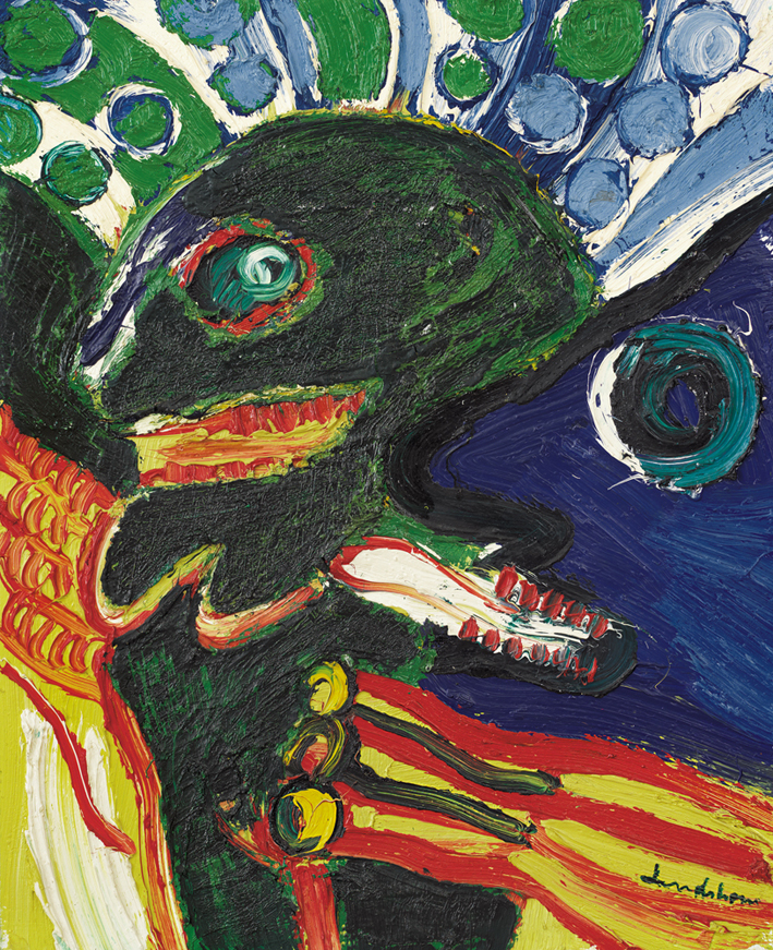 BENGT LINDSTROM Stoccolma 1925 - Njurunda 30/01/2008 Les Hommes du nord, (1968) olio su tela cm. 100x81, firma in basso a destra, etichetta della New Style Gallery (Den Haag) al retro, opera registrata presso l'Archivio Bengt Lindstrom a cura dell'Association des Amis de L'oevre de Bengt Lindstrom come da dichiarazione su foto.
