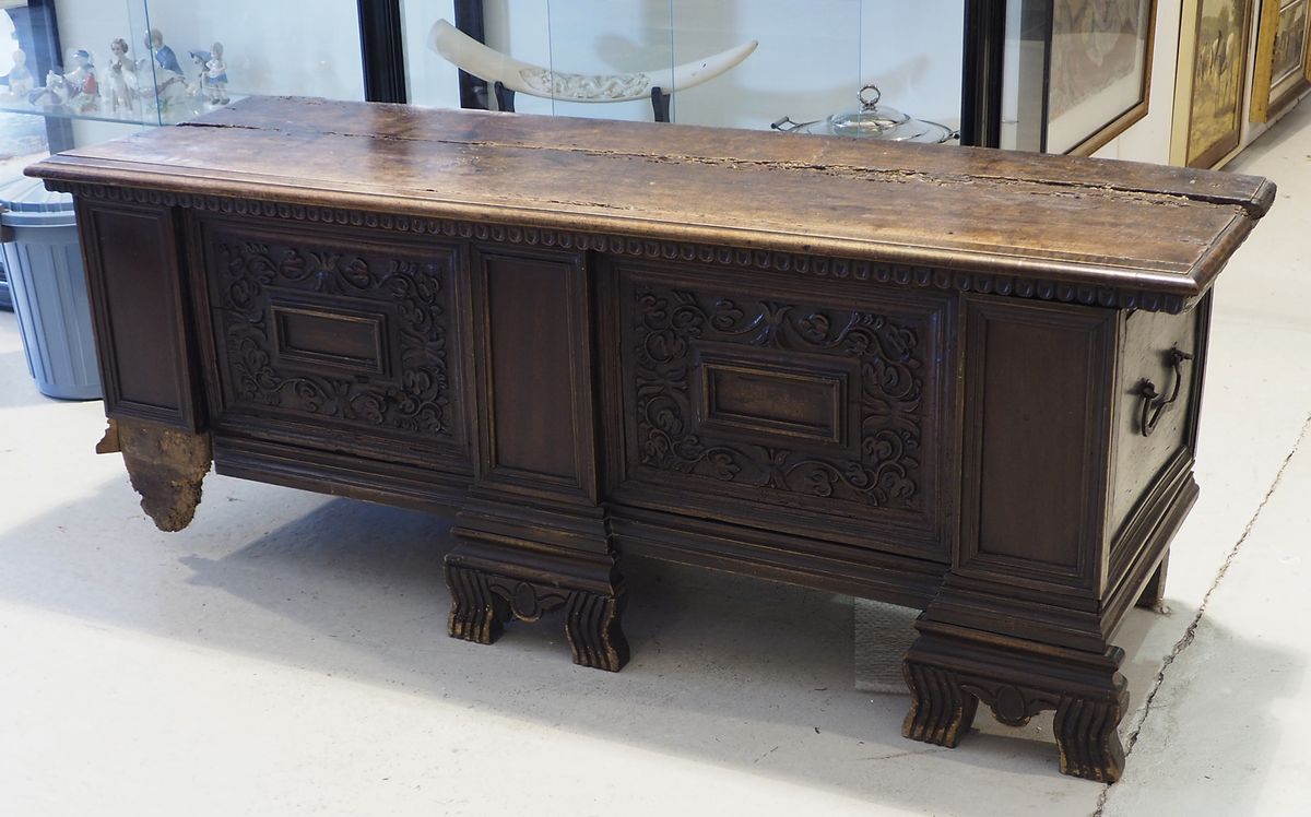 Antica cassapanca in legno scolpito. cm. 54x170x58.