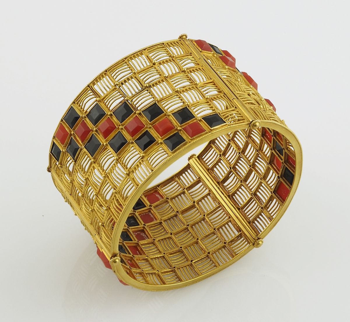Lotto 43 | Bracciale in oro giallo rigido a settori con elementi in corniola e onice, gr 76