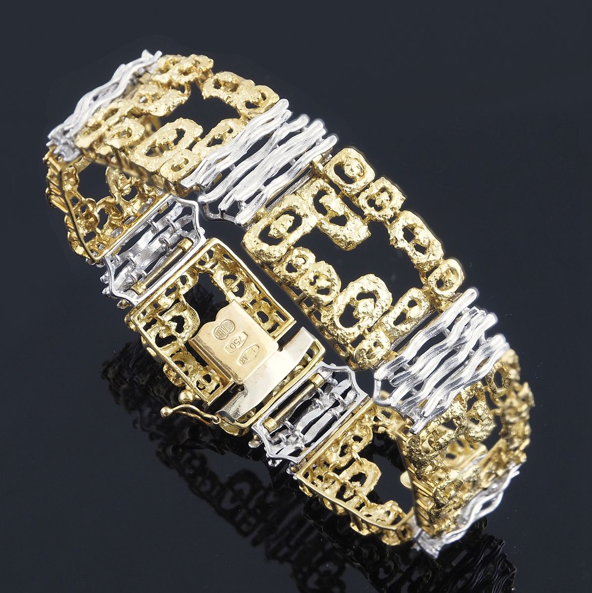 Bracciale in oro giallo e bianco satinato semirigido a settori, gr 47 Uno a Erre