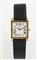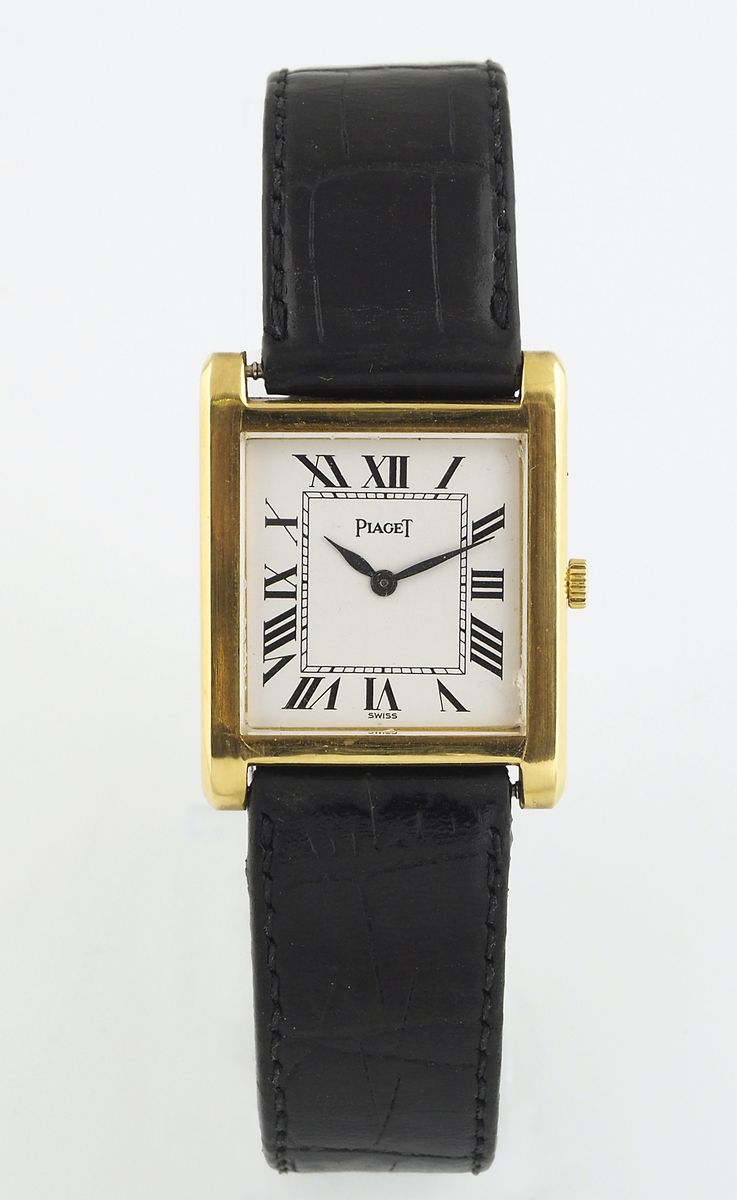 Piaget: orologio da polso con cassa rettangolare in oro giallo, quadrante bianco con numeri romani, cinturino in pelle con fibbia in oro giallo.