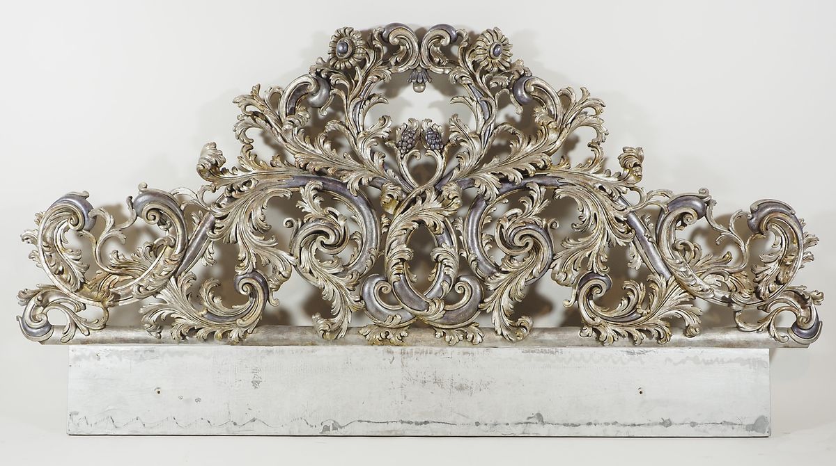 Testiera di letto matrimoniale in legno argentato finemente scolpito a foglie e volute. Lung. cm. 195. h. cm. 105.