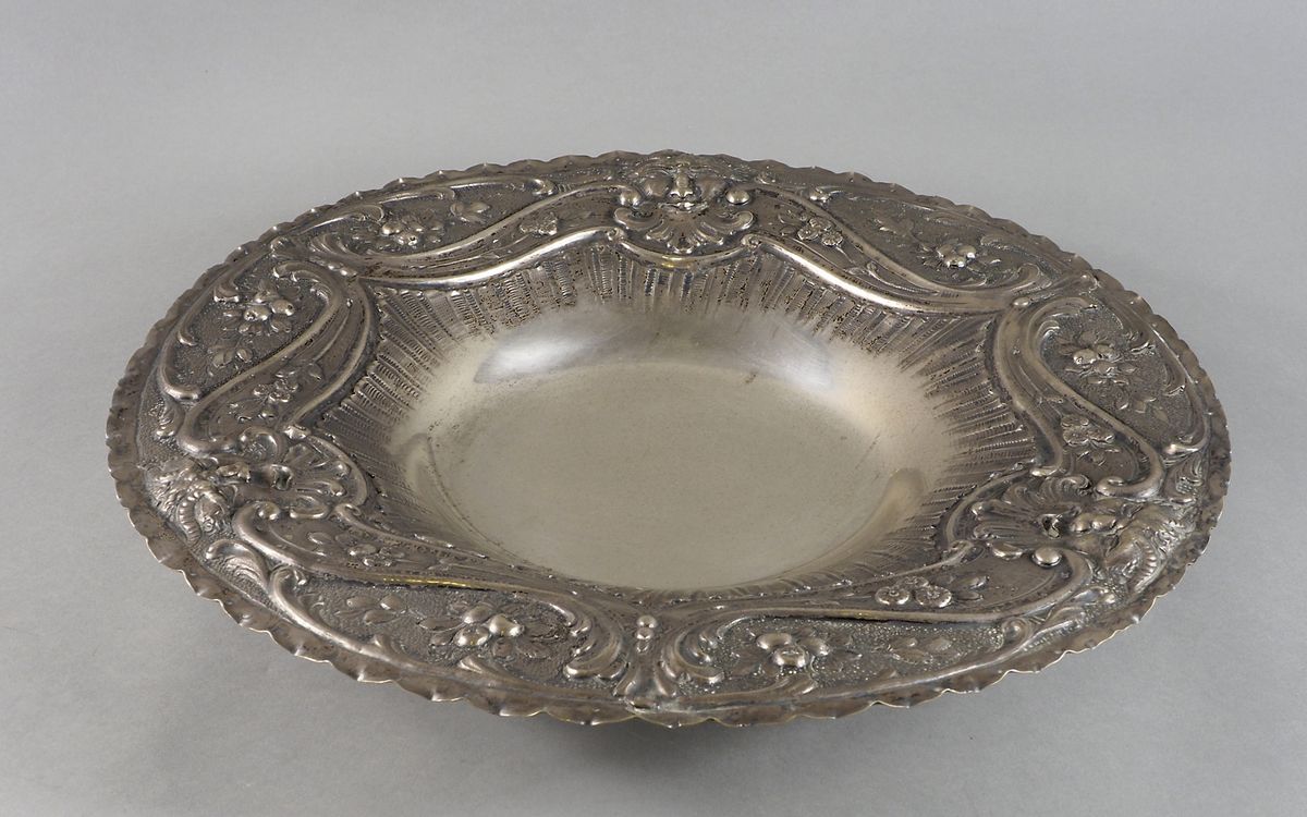 Piatto rotondo in argento finemente lavorato a sbalzo a motivi floreali, su 3...