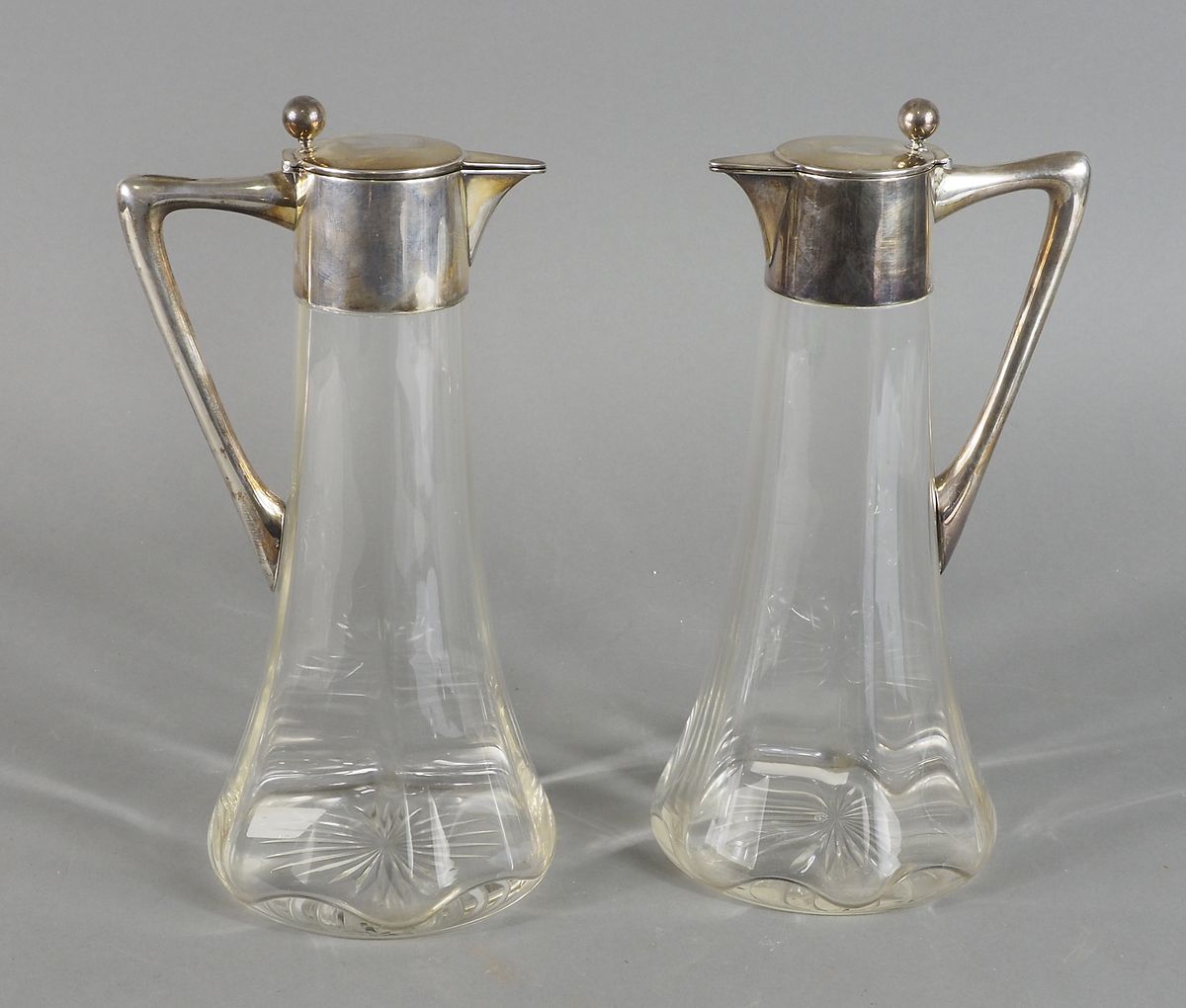 Coppia di brocce in cristallo con manico, collo e tappo in argento. Austria,...