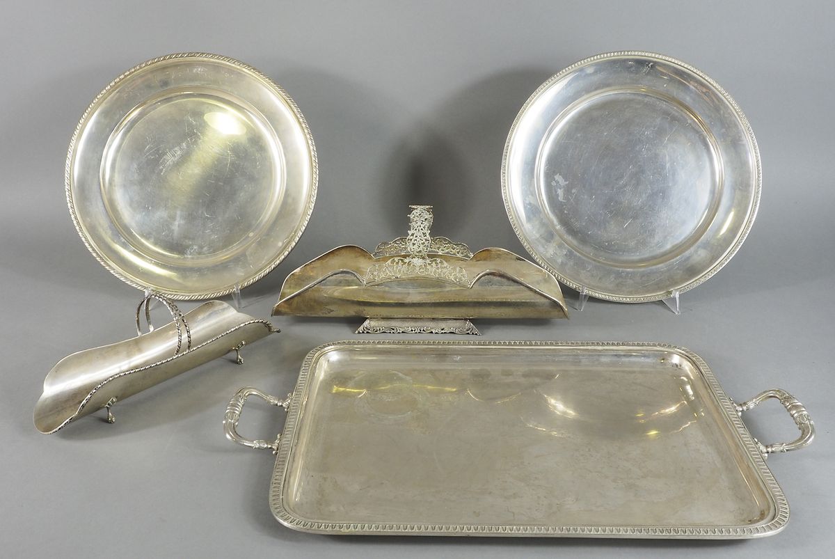 Lotto di vari oggetti in argento tra cui vassoio rettangolare e portagrissini. gr. tot 2780.