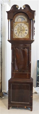 Grande orologio da terra in legno con colonnette aventi capitelli in metallo dorato, quadrante con numeri romani. XIX secolo. H. cm. 235.