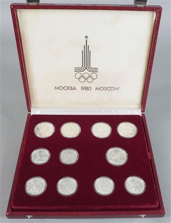 Serie di 28 monete in argento delle Olimpiadi di Mosca 1980. Entro astuccio originale. gr. 700.