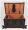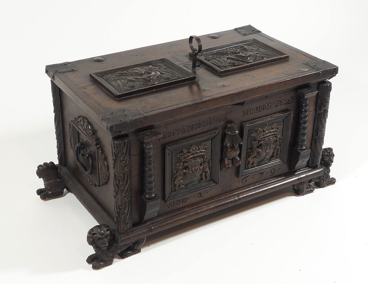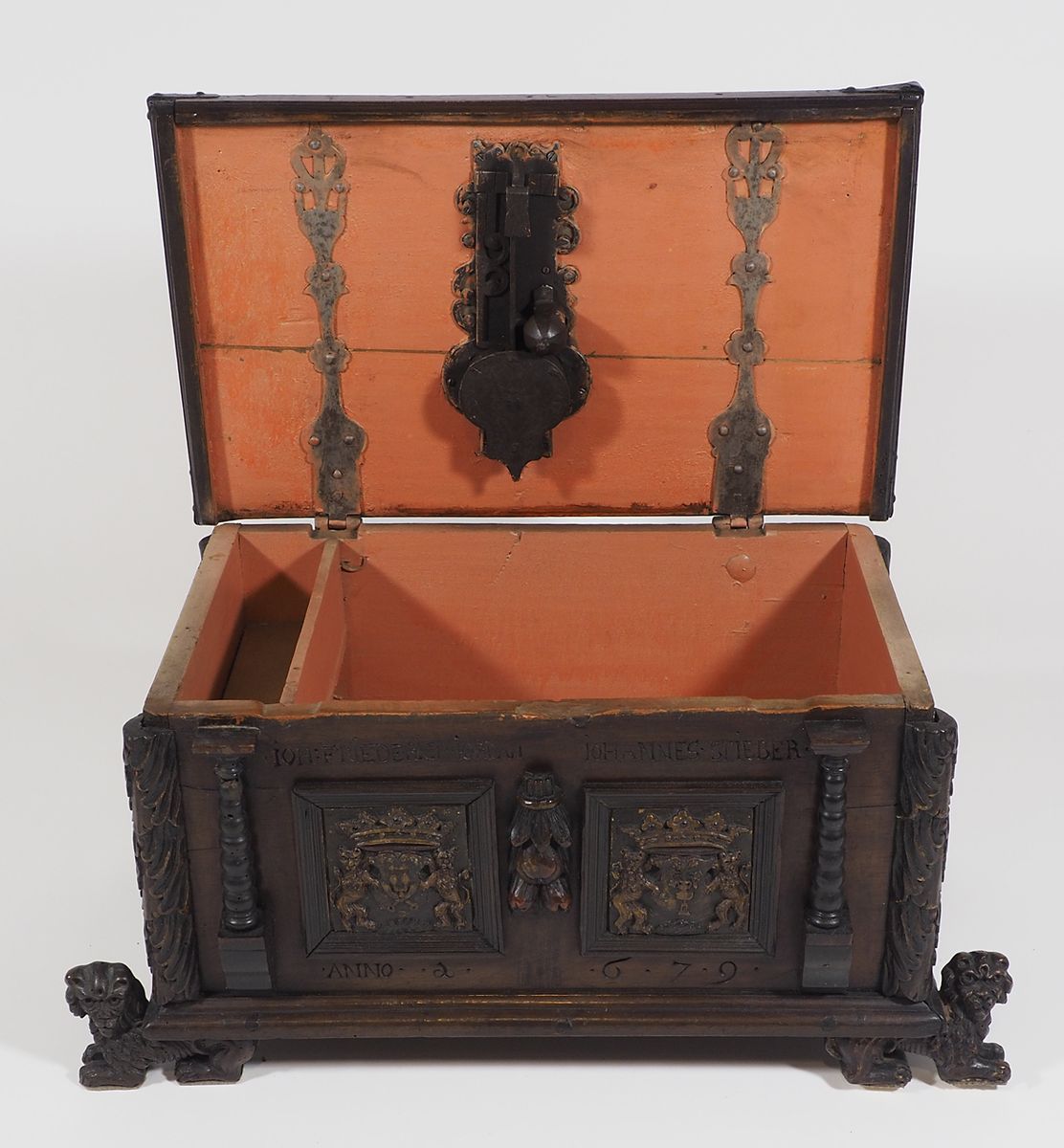 Piccola cassa sociale delle corporazioni dei sarti dei vasai in legno finemente scolpito, zampe a forma di leoni. Germania meridionale, XVIII secolo. cm. 40x70x37.