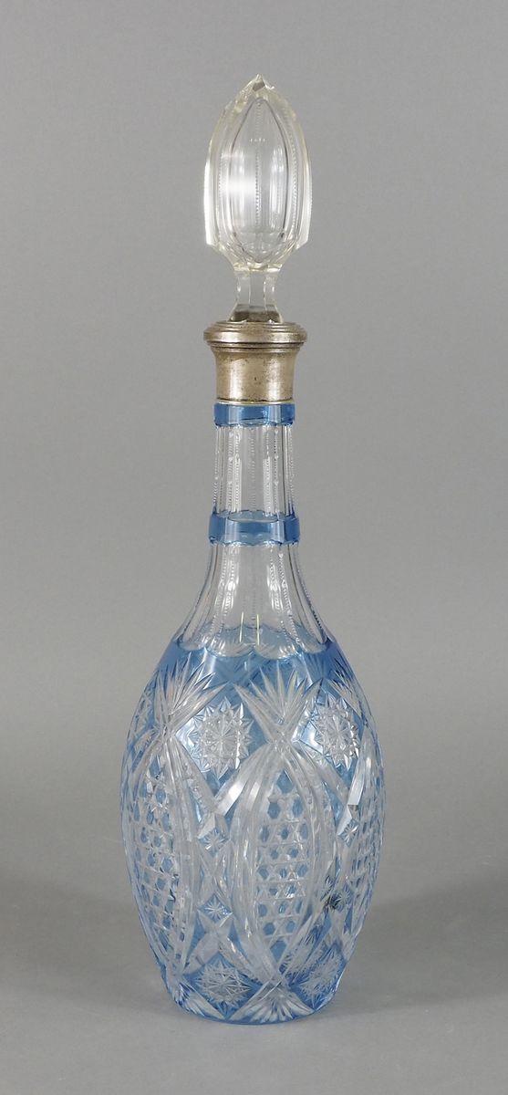 Bottiglia in cristallo azzurro con decori e grande tappo, collo in argento. Inizio XX secolo. H. tot cm. 52.