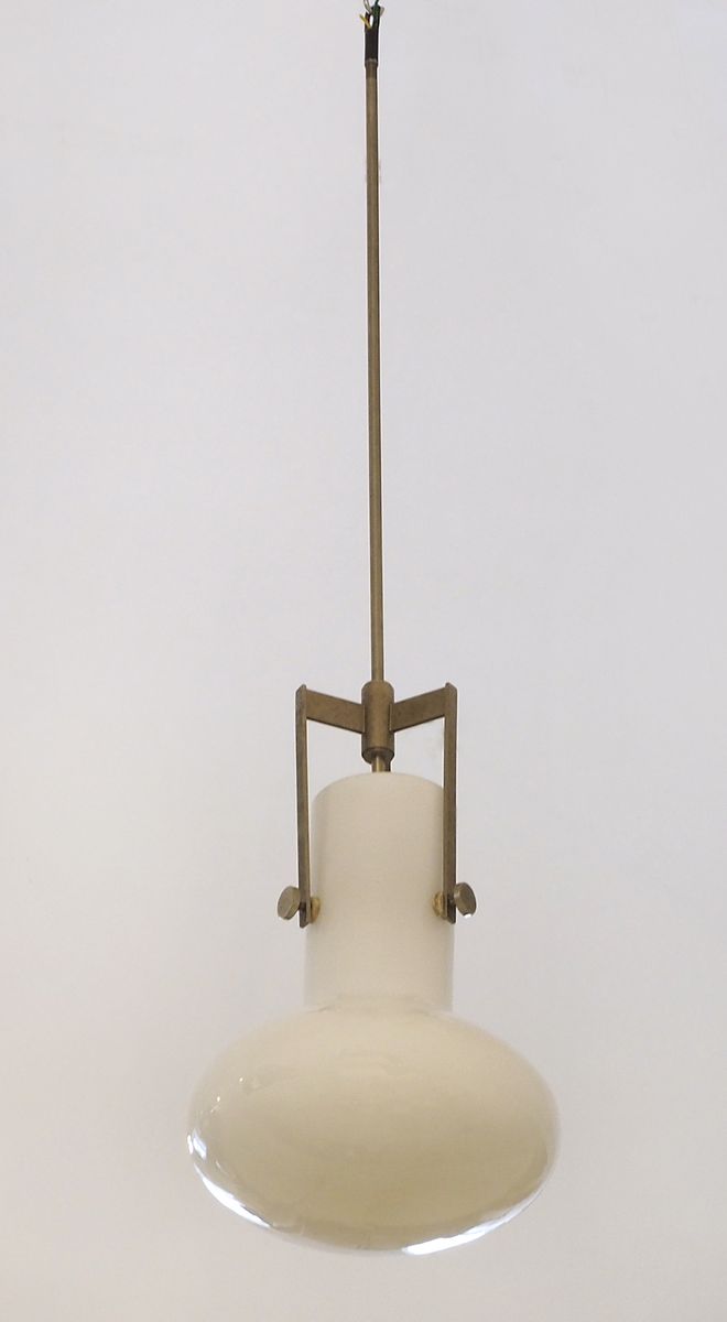Venini: lampada a sospensione in vetro opalino con montatura in acciaio.