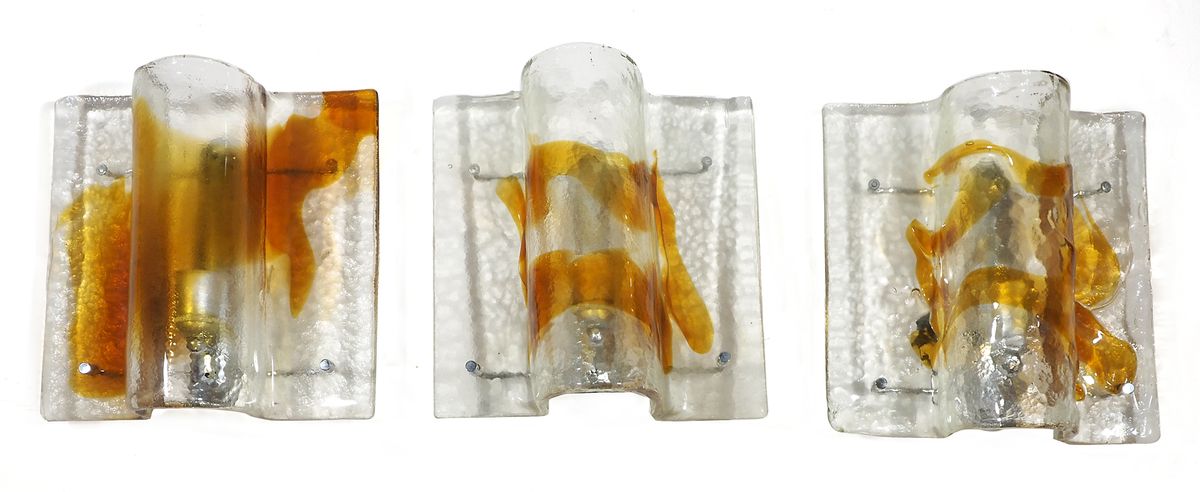 Lotto di 3 appliques in vetro a due colori con struttura cromata. Anni '60.