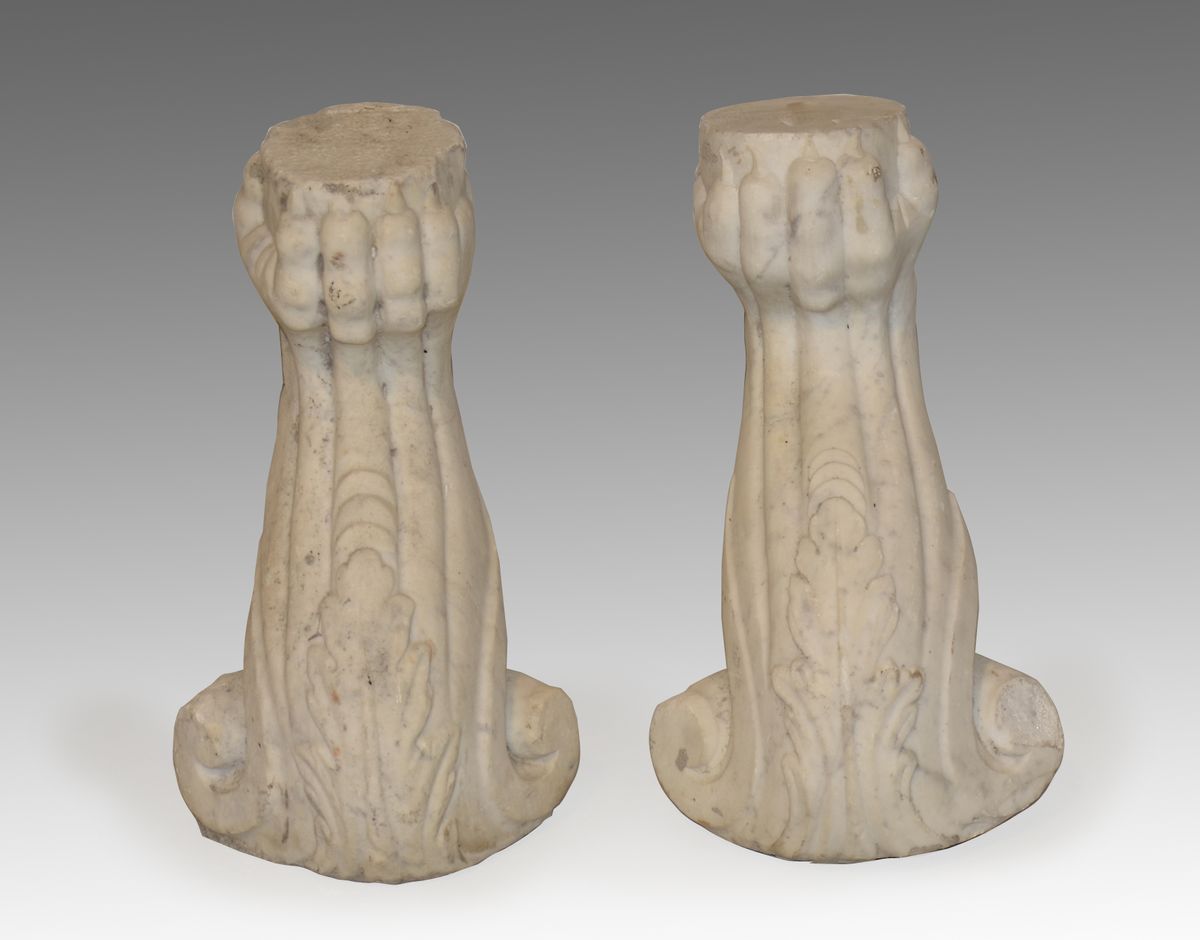 Coppia di basi in marmo a forma di zampe ferine. H. cm. 41.