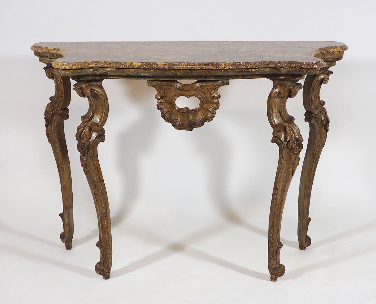 Consolle in legno su alte gambe mosse scolpite, piano sagomato in marmo. XVIII secolo. cm. 80x130x50.