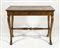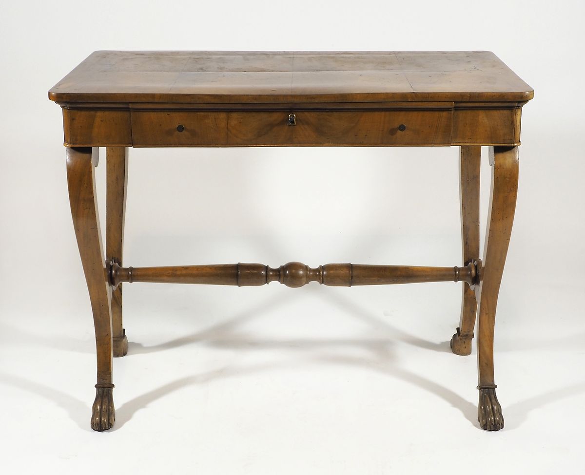 Scrivania da centro in legno con cassetto centrale, su gambe a sciabola con terminali ferini unite da traversa. XIX secolo. cm. 78x97x55.