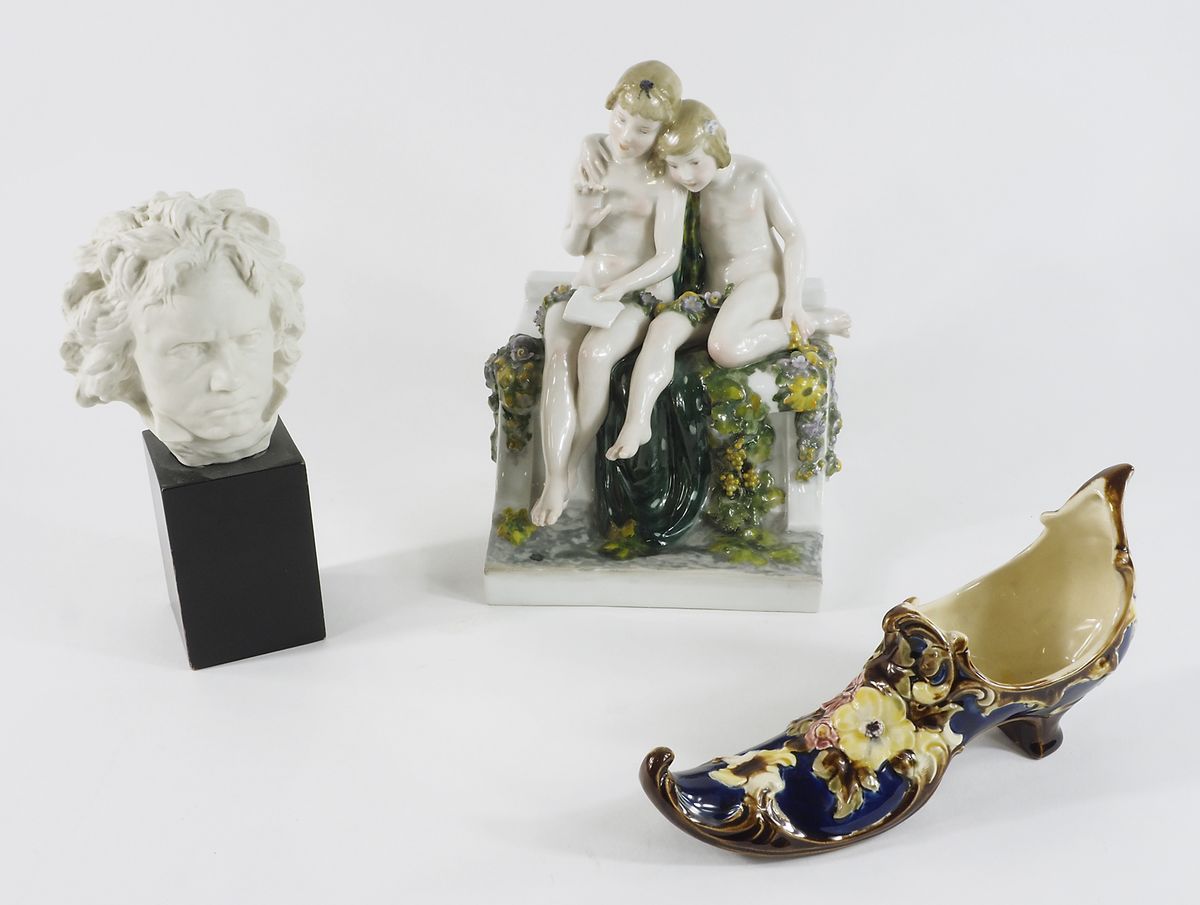 Lotto di 3 oggetti vari tra cui gruppo in porcellana e testa Rosenthal. (difetto).