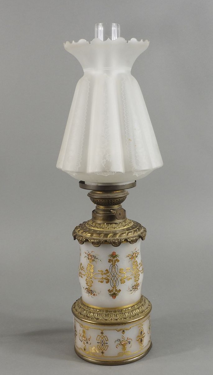 Lampada da tavolo in vetro opalino decorato a motivi floreali dorati. H. tot cm. 50.