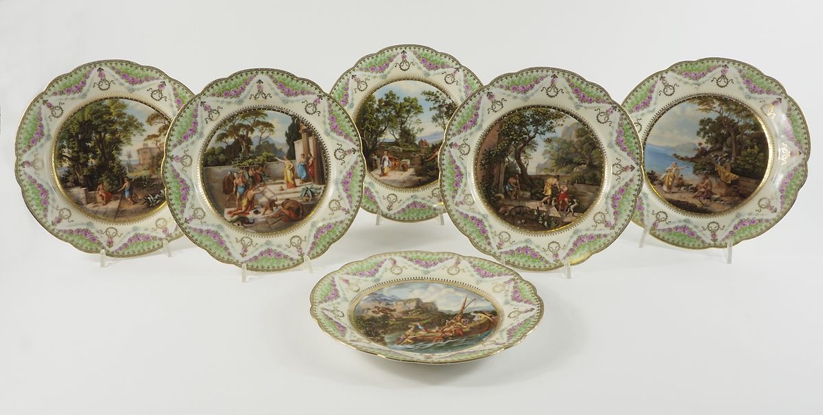 Lotto di 6 piatti in porcellana policroma decorati al centro con scene di paesaggio. Vienna.