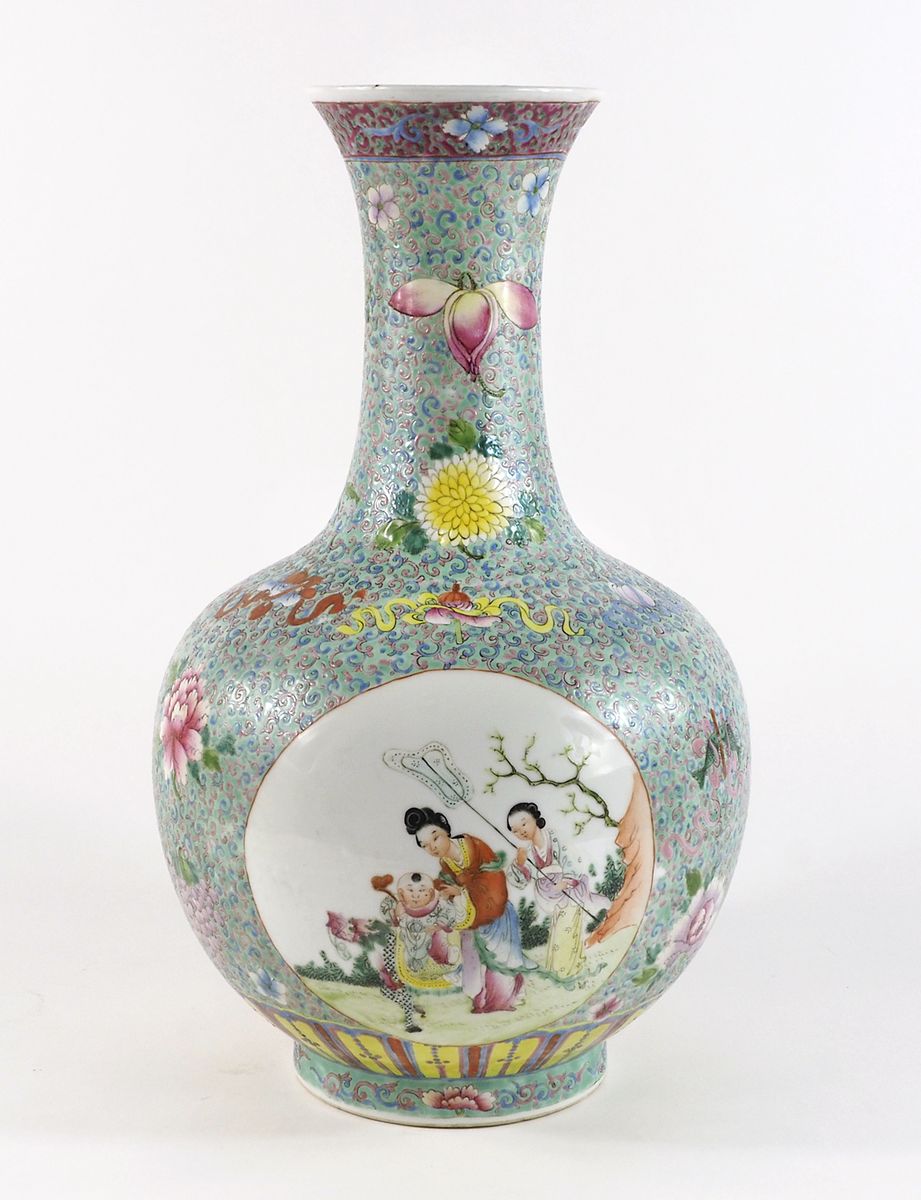 Vaso in porcellana policroma decorato a motivi orientali e floreali. H. cm. 45. (sbeccature).