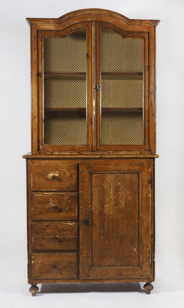 Credenza rustica a doppio corpo, parte inferiore con anta e 4 cassetti, parte...