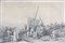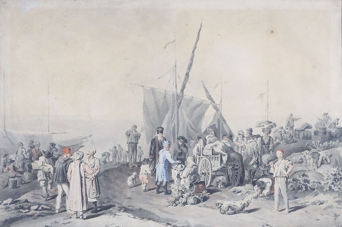 Stampa a colori raffigurante personaggi al porto, cm. 37x49.