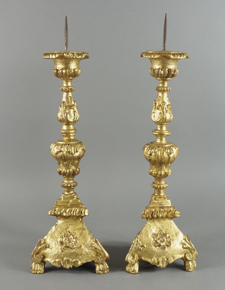 Paio di portaceri da tavolo in legno dorato. H. cm. 40.